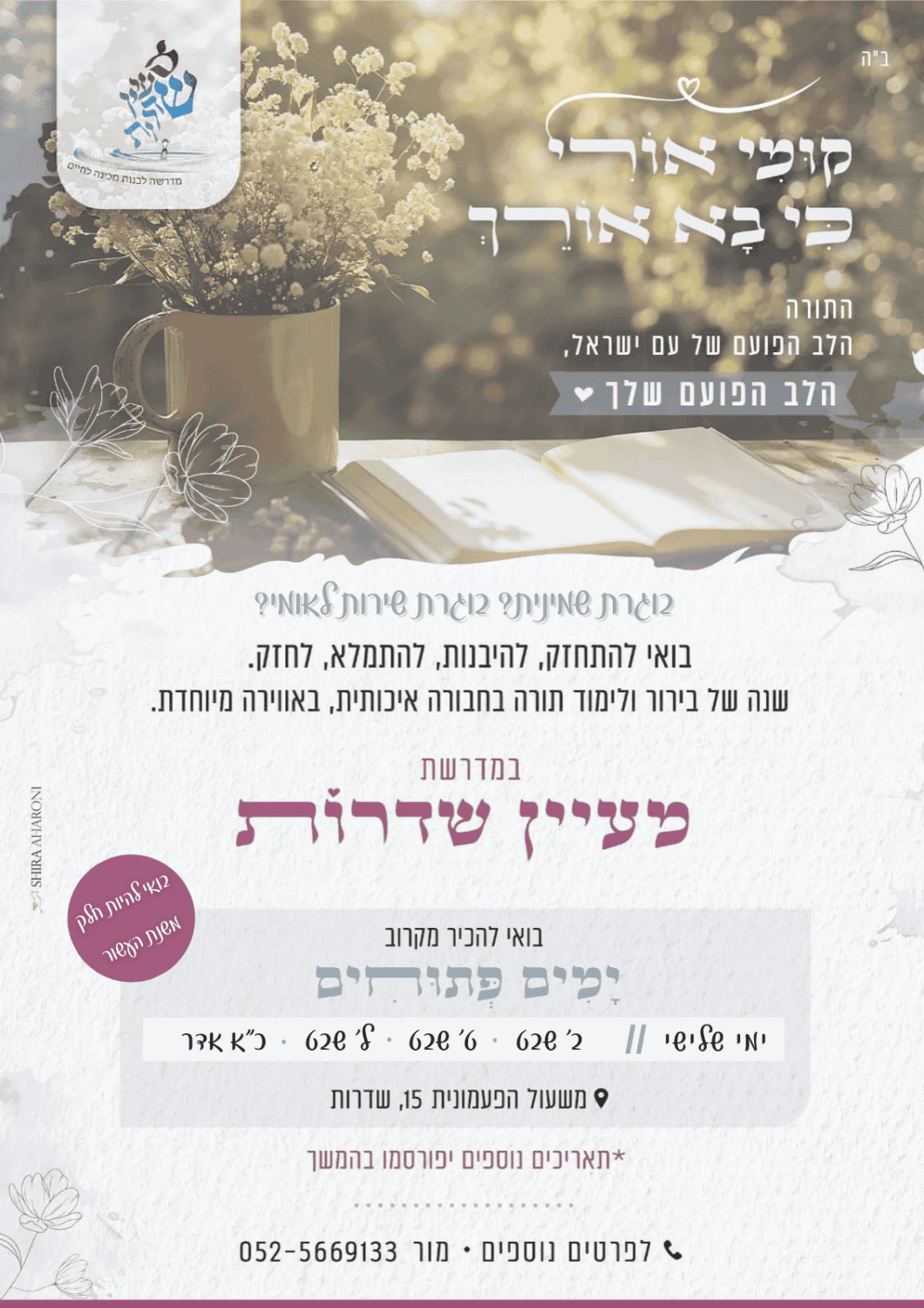 יום פתוח לשבת מדרשה במדרשת מעיין שדרות לשנת תשפ"ז בואי ליום חוויתי, עשיר בשיעורים והיכרות עם המדרשה להרשמה >> כאן